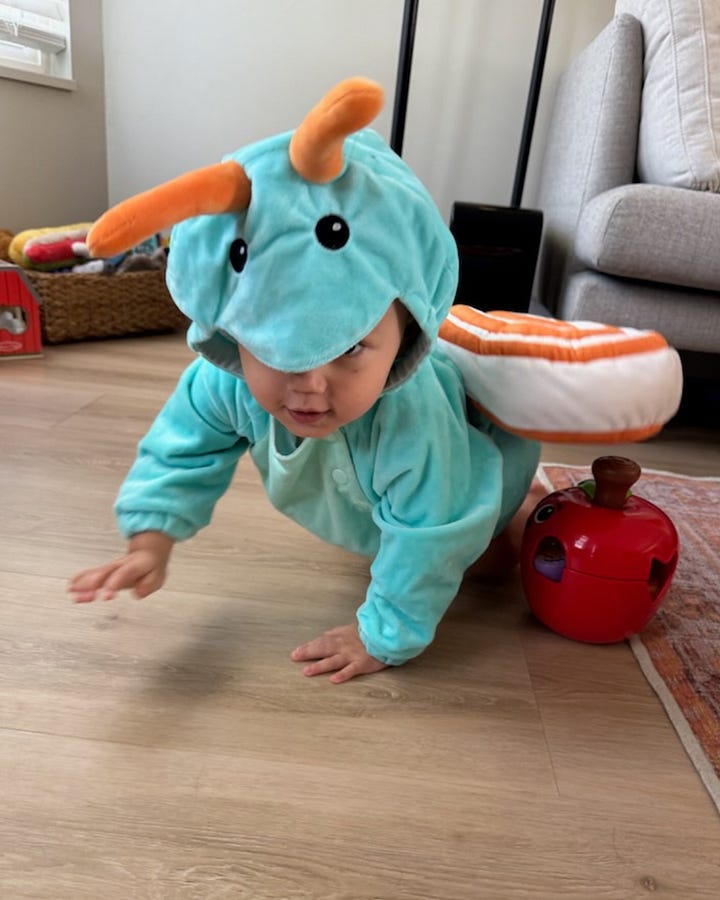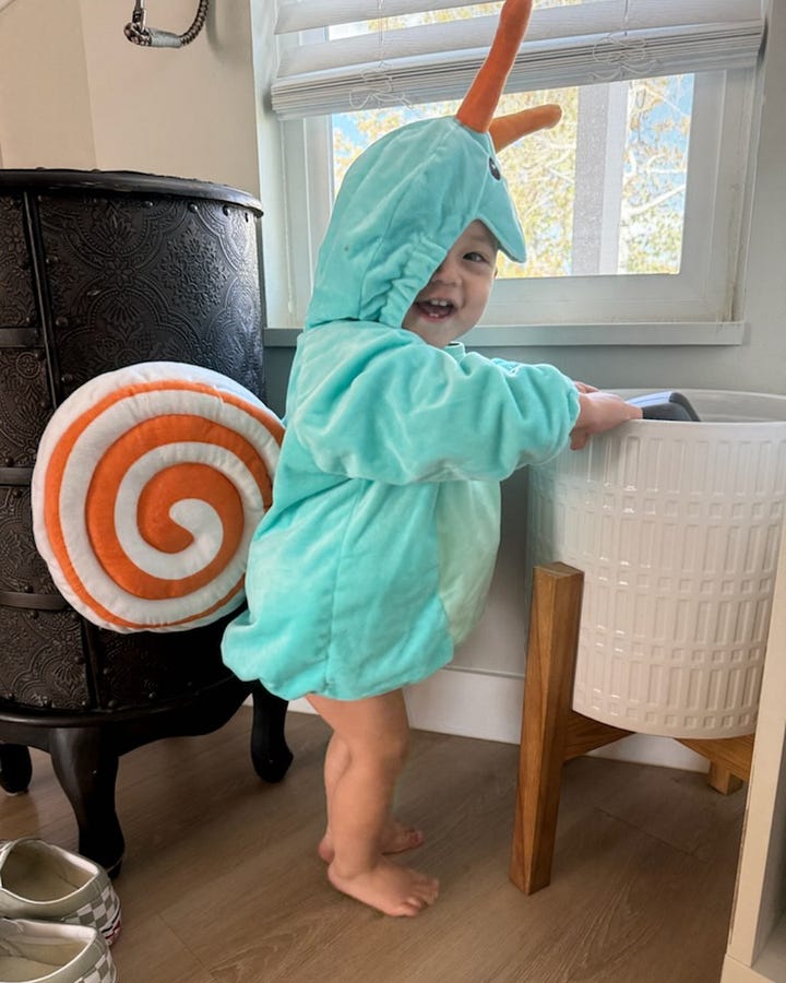 Last weekend when my in-laws were in town, we were waiting for a brunch table and I noticed a children’s secondhand store nearby. Since I do not have kids, I never thought about going in, but curiosity got me. The first thing I saw was a snail costume, and instantly I pictured my nephew in it. I bought it, popped it in the mail, and tucked in a cute snack cup and sippy cup from a women owned small business in town.